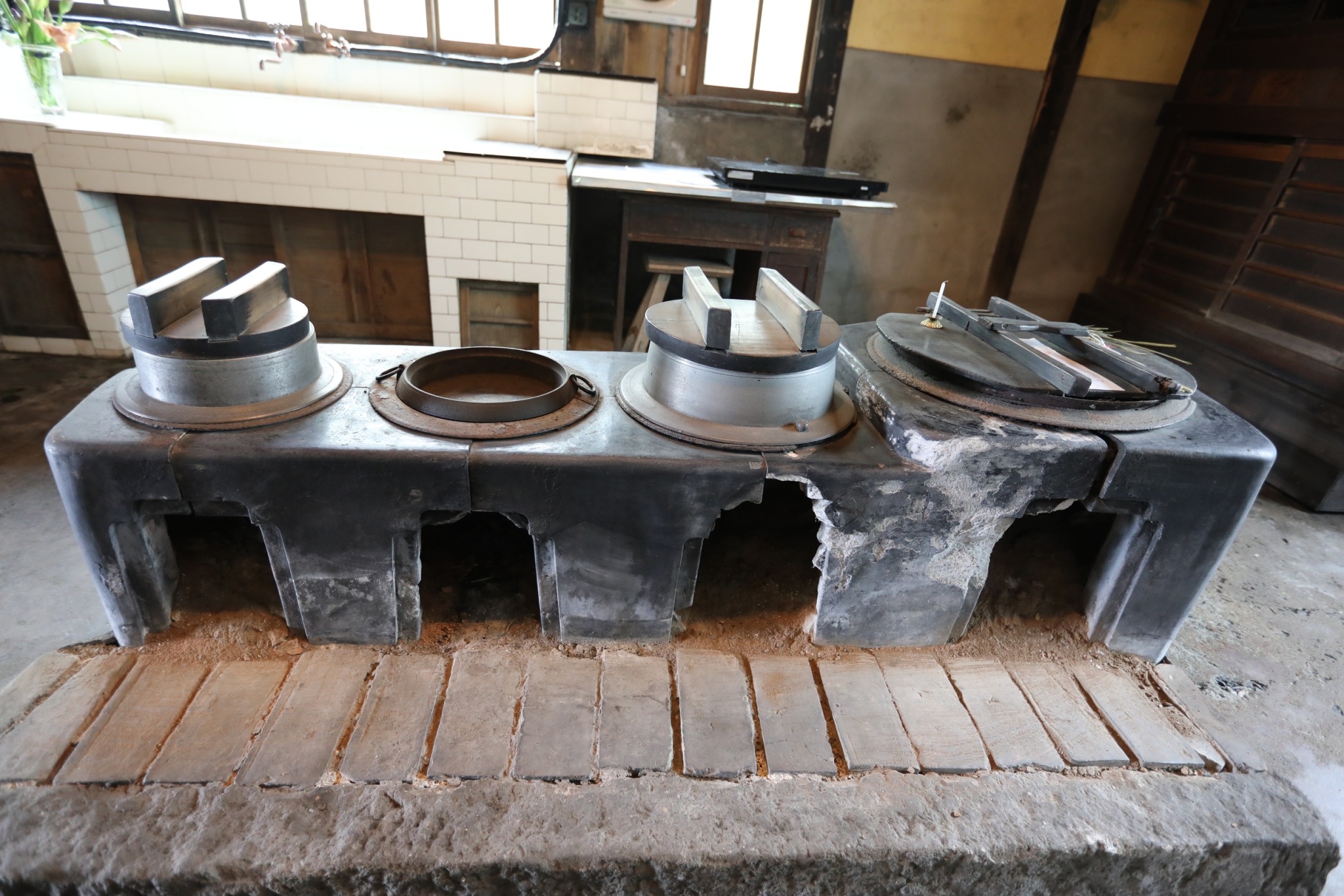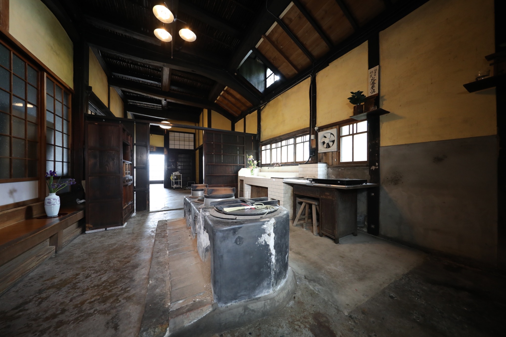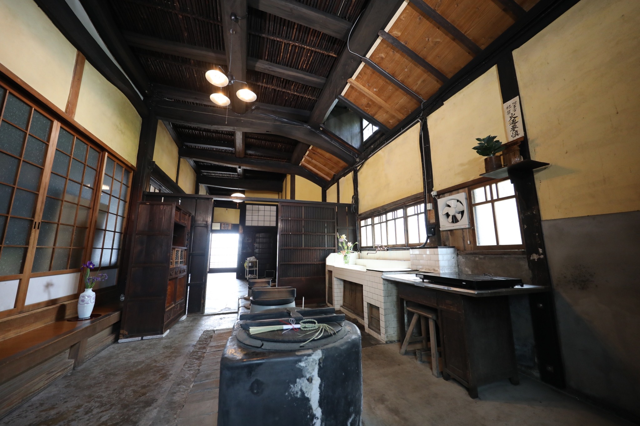 黒漆喰磨きのおくどさんやタイル貼りの流し台も、当時の繁栄を物語る希少な意匠です。
