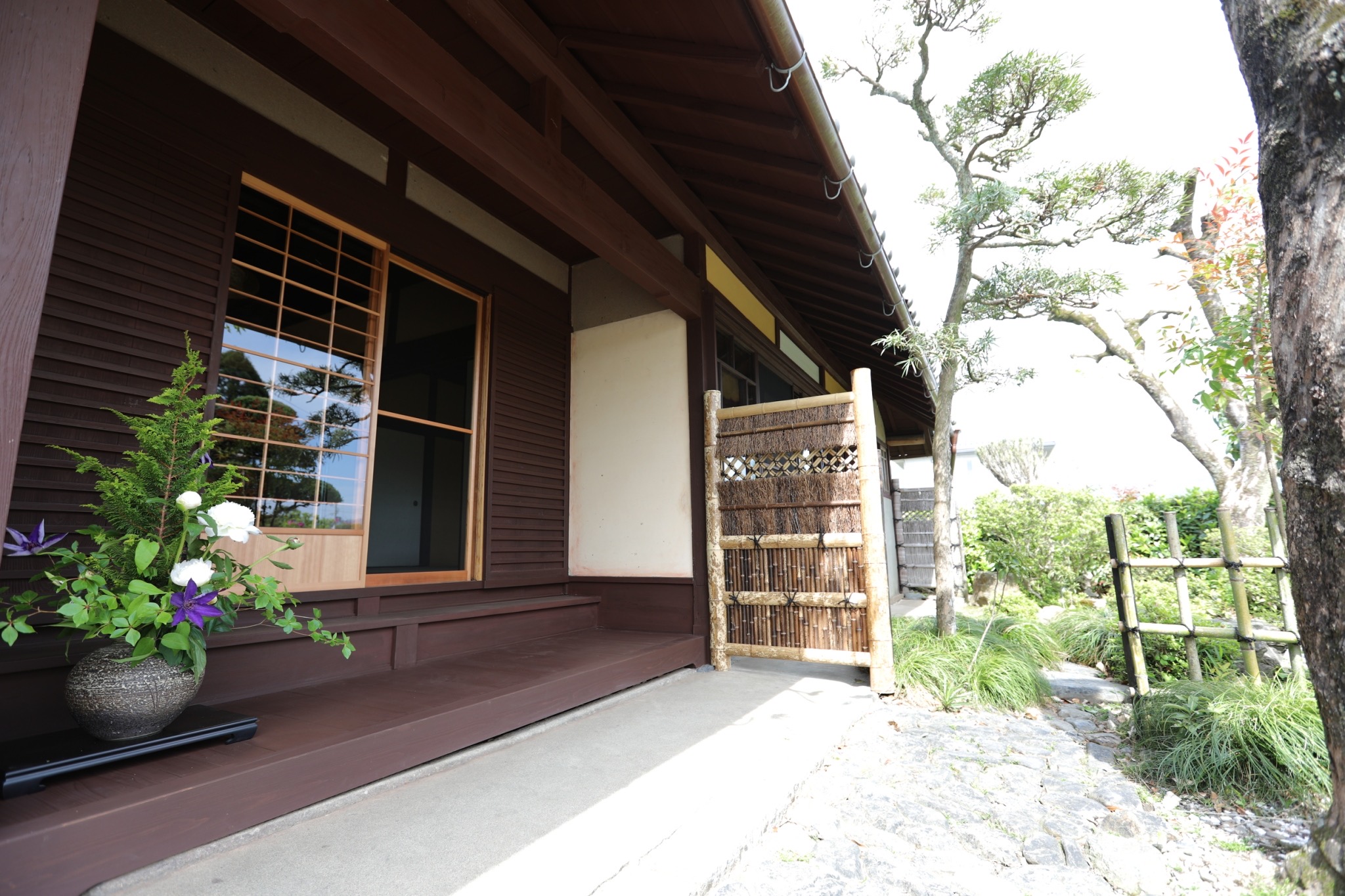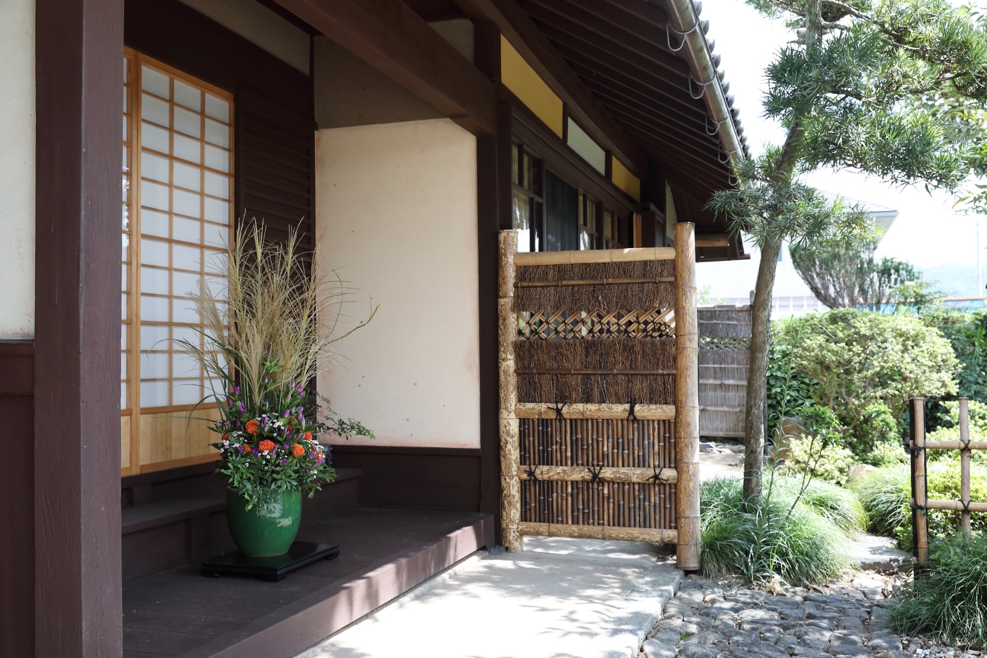 敷地を囲む野面積みの石垣と低めの土塀が地域性を映し出し、植栽による垣根が目隠しと通風を両立。