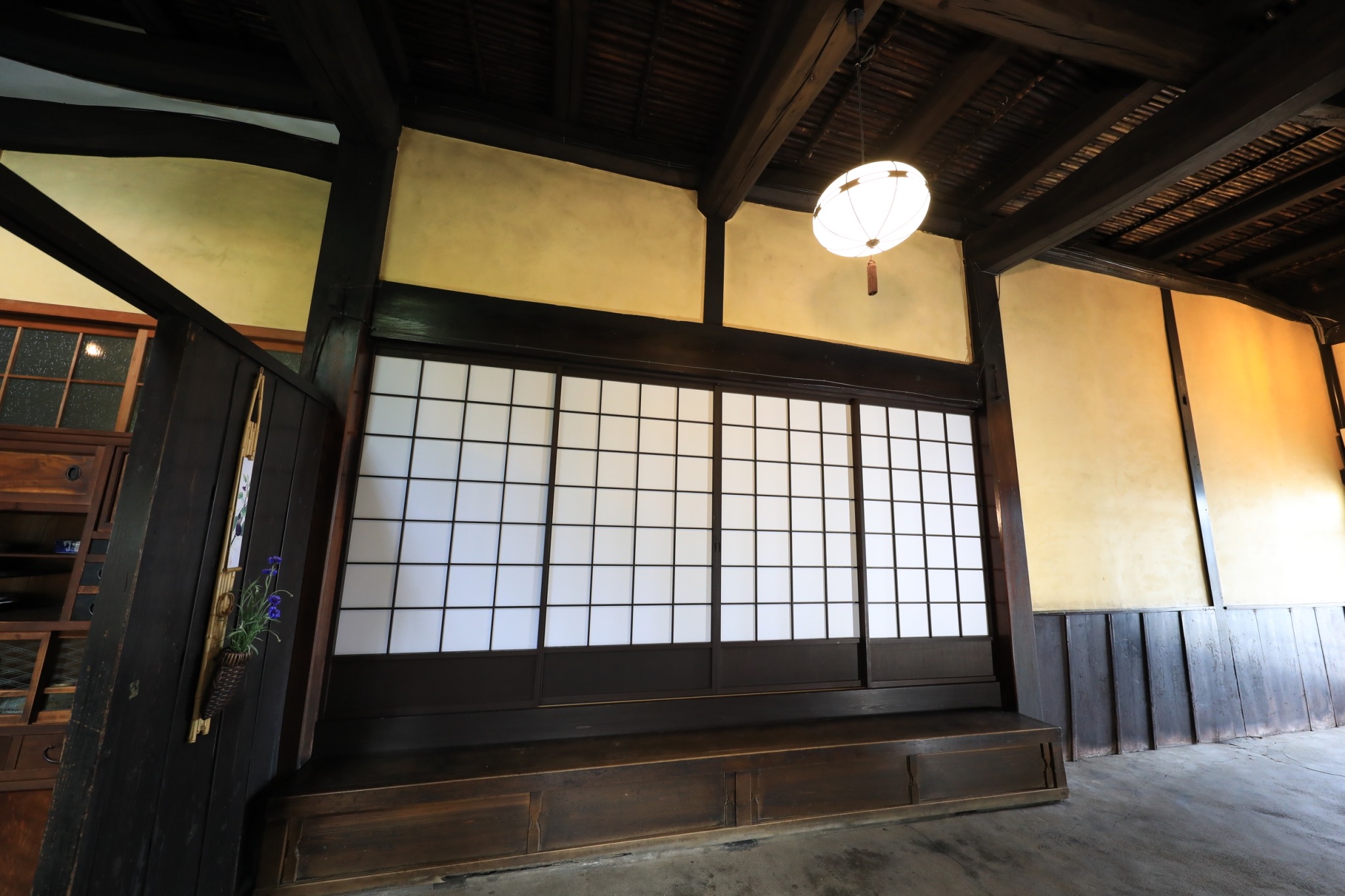 浅黄の玄関、卵漆喰の土間、漆喰仕上げの台所、中塗りの納戸、繊維壁の座敷など、多彩な土壁が職人